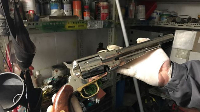 W trakcie przeszukania znaleziono rewolwer. Broń oczywiście trafiła do ekspertyzy. Jednak na podstawie zdjęcia można wywnioskować, że jest to przerobiony rewolwer czarnoprochowy. W rewolwerze zamontowano bęben przeznaczony do amunicji scalonej. Oryginalnie taka broń wyposażona jest w bęben umożliwiający odstrzeliwanie ładunków rozdzielnego ładowania czyli zamiast naboju, do rewolweru osobno sypiemy proch i wciskamy kulę z użyciem dźwigni zainstalowanej pod lufą (zwanej pobojczykiem).